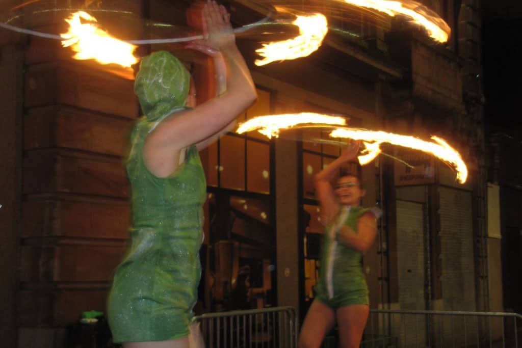 Fire performance produced by Conflux. The costumes needing fireproofing for the performance, Mona created her own painted fabric that would facilitate the movement of the fire spinners. The jackets were upcycled from 2nd hand sources.