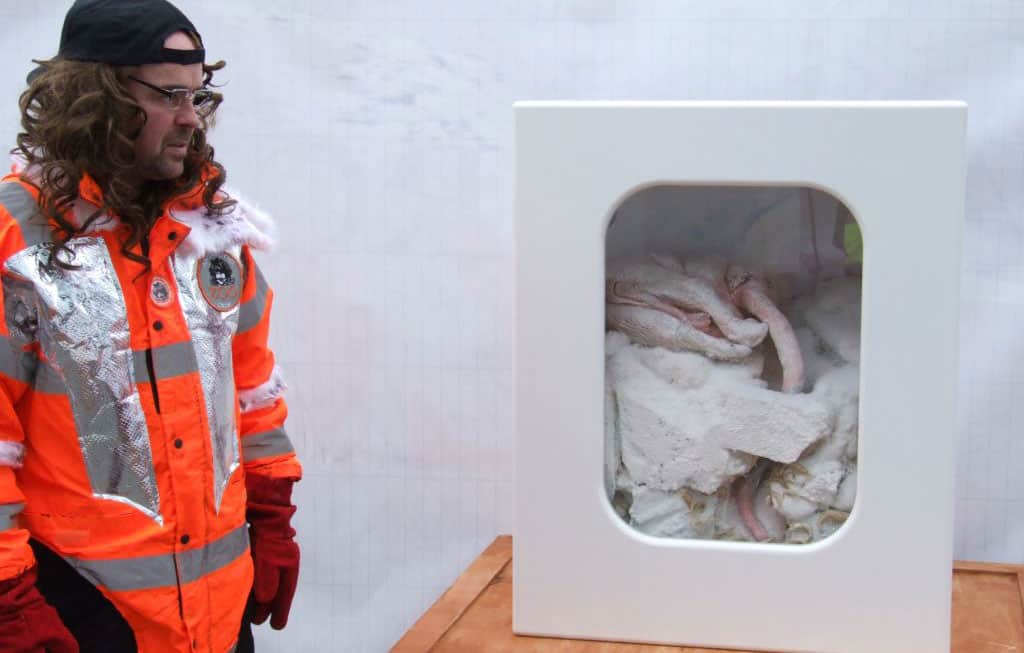 Until recently those claims were met with ridicule and derision, but Senior Research Assistant Gretchen Pankhurst has developed an inspirational way to restore the Professor’s credibility and educate the public at the same time. Gretchen realised the potential to transport and exhibit the creatures during their hibernating state in ‘Thermostatic Vivariums’ (fridges) and return them to their natural habitats unharmed in good time for their natural awakening.”