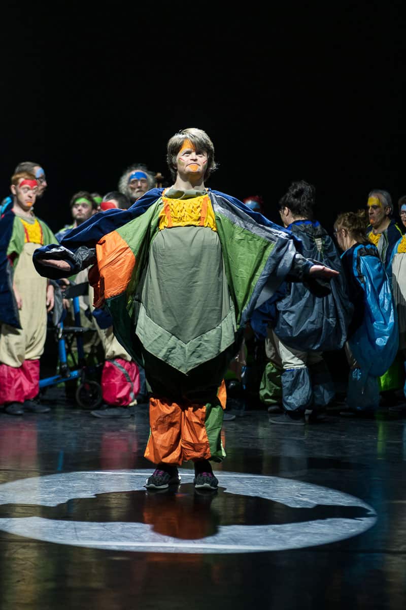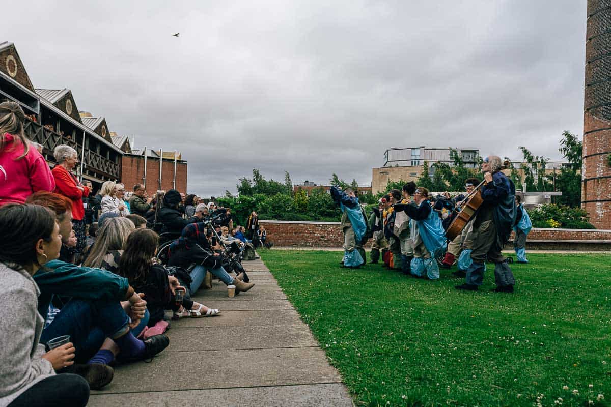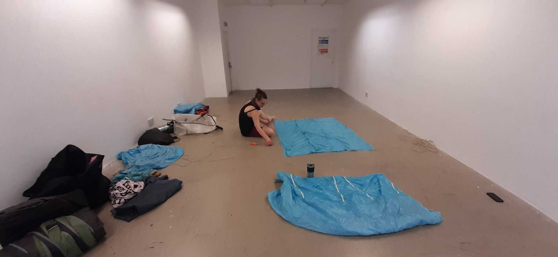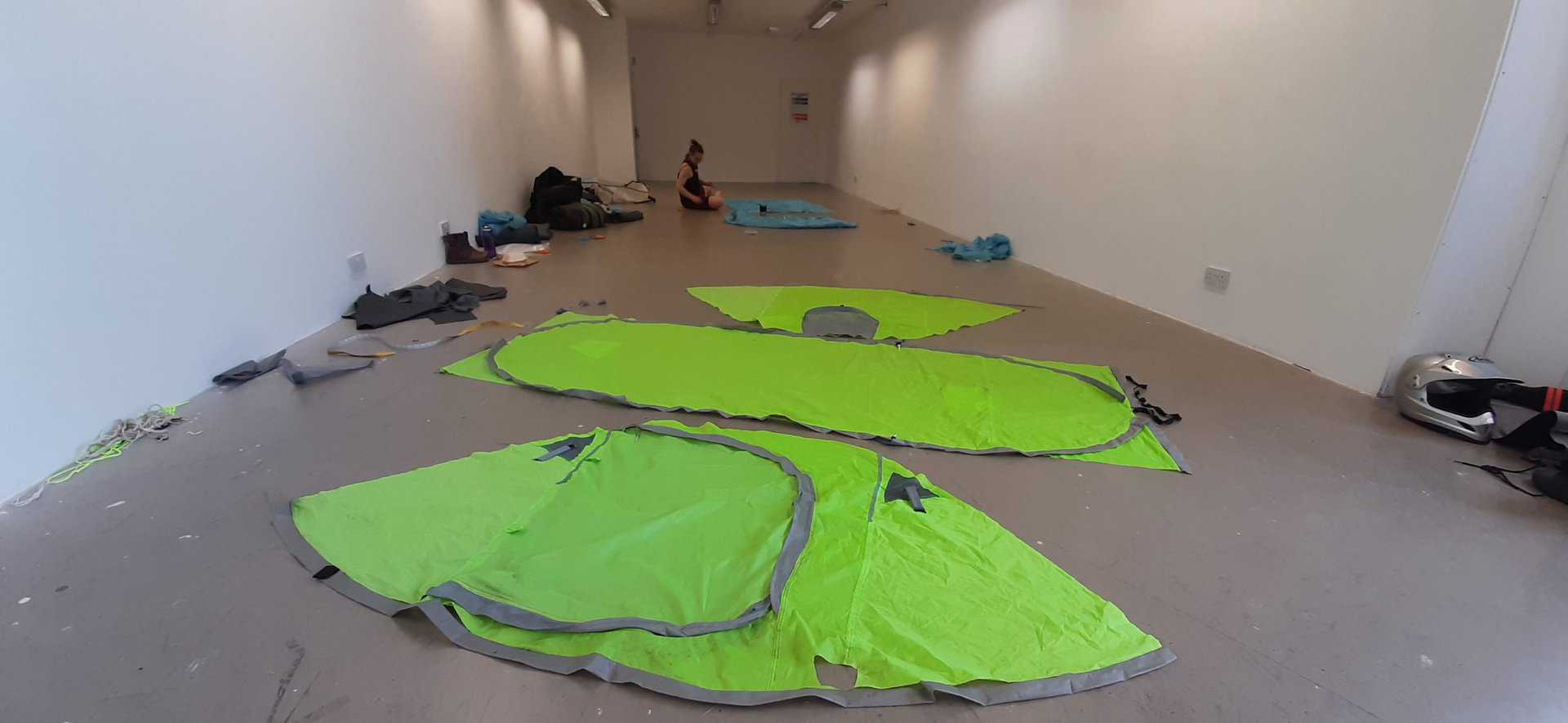 The costumes are designed using charity shop finds and discarded materials such as broken camping tents, airbed mattresses and parachutes to of Antarctica’s cold weather and to create a soundscape when the performers move with the wind. Items were kindly donated by community members reducing the amount of broken item ending up in landfill.
